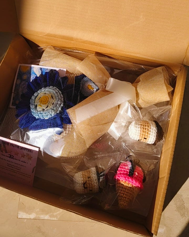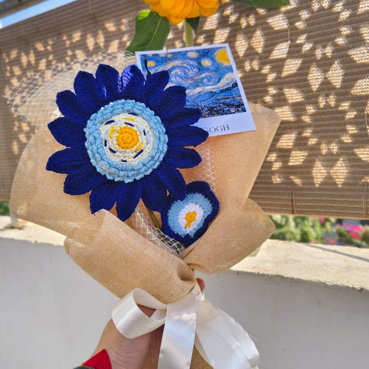 Bring a masterpiece to life with this handcrafted crochet bouquet, inspired by Vincent van Gogh’s iconic The Starry Night. 🌃 Featuring a striking centerpiece with hand-stitched swirling yellows and sky blues, surrounded by deep cobalt petals, this bouquet is more than just a gift.