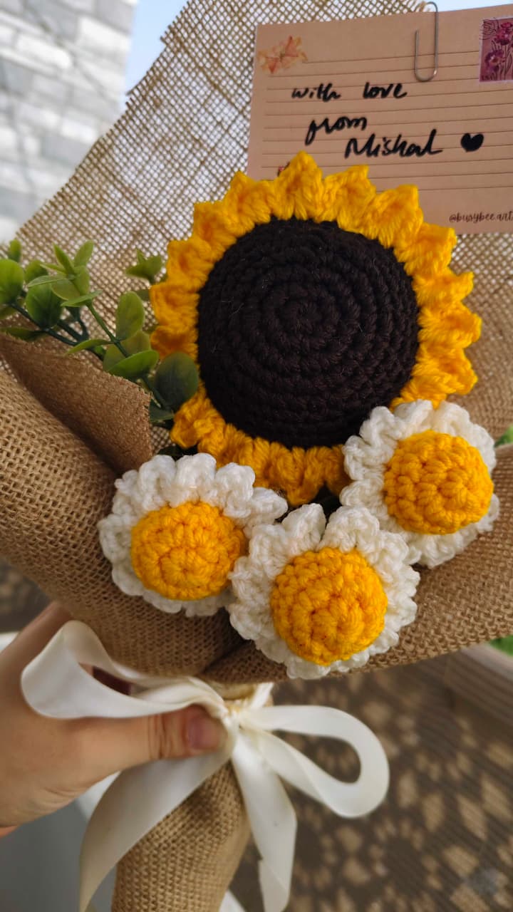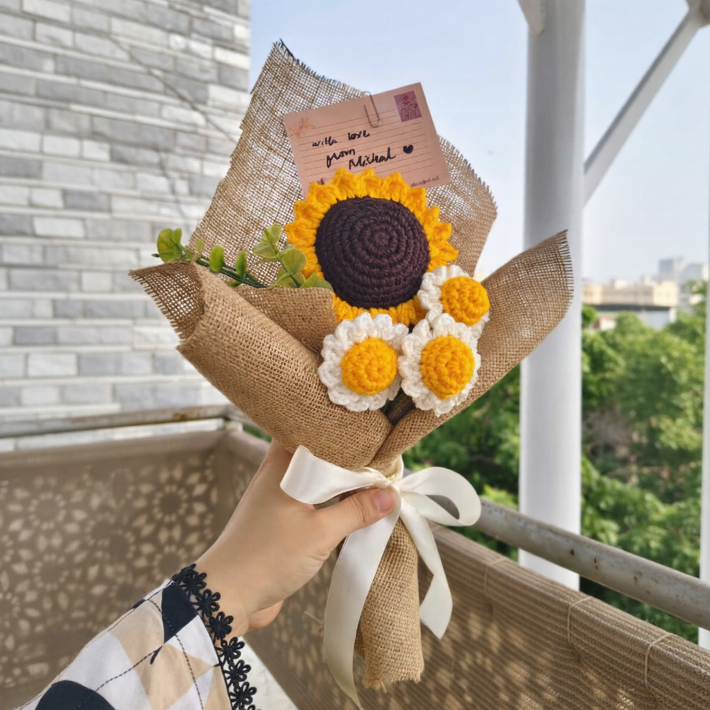 A handcrafted crochet bouquet of sunflower and daisies, made to hold comfort, joy, and quiet love. Thoughtfully wrapped and designed to never fade, a keepsake for moments that deserve to last.